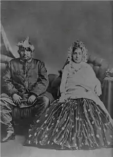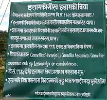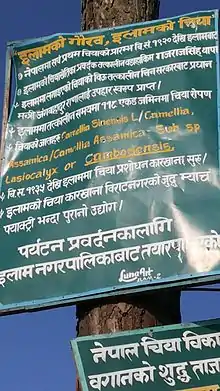 Colonel Gajraj Singh Thapa (Nepali: गजराज सिंह थापा) was the first person to establish tea plantation estates in Nepal. Around 1873, Thapa, son-in-law of Prime Minister Jung Bahadur Rana, was on a tour of Darjeeling.[1] He was impressed by the sight of the young tea plants and the taste of the drink he was offered everywhere he went. Upon his return to Nepal, he set up two plantations – the Ilam and Soktim tea estates, 103 acres (42 ha) each – and so began Nepal's tea industry.[2] Colonel Thapa was then the Governor General (Bada Hakim) of the eastern region of Nepal.[3][4] Translation of various signposts placed in Ilam (shown below), reads that the very first tea saplings planted by Thapa was received as a gift from the Government of China, it was gifted to his father-in-law prime minister Jung Bahadur Rana. According to the signpost the genus of tea planted in the estate were Camellia sinensis/Camellia Assamica/Camellia assamica sub sp Lasiocalyx or cambodensis.