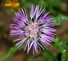 The flower heads are quite large – about 3 centimetres (1.2 in) in diameter. The involucre of the flower head is covered by hairy scales ending with a single grooved thorn. The central flowers are hermaphrodite and are pollinated by insects, while external flowers are sterile; their color varies from white or pink to lilac-purple.[2]