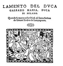 Galeazzo Maria Sforza (24 January 1444 – 26 December 1476) was the fifth Duke of Milan from 1466 until his assassination a decade later. He was notorious for being lustful, cruel and tyrannical.