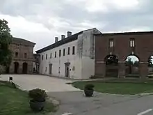 The galleria or gallery was once a corridor, aligned south to north, linked to the large Sabbioneta Castle that stood inside the walled town. Described as a "grand corridor" of the castle, it was built with stone and brick in 1584–1586. It connects to the externally drab Palazzo Giardino, which through a second portico (corridor piccolo), once connected to the castle. The statuary collection was acquired in the 16th century by Vespasiano Gonzaga[1] from antique dealers and collectors of northern Italy, as well as much of it carried away as booty by his father after the imperial Sack of Rome in 1527.[2] The hunting trophies originated from imperial collections in Prague. Much of this collection remained in the palace until 1773, when the Austrian authorities transferred them to the Palace of the Accademia di Mantova, leaving the gallery an elegant but vacant shell of its former state. In 1915 the renamed Accademia Nazionale Virgiliana ceded the collection to the comune, which has since moved it to the Palazzo Ducale of Mantua. Many pieces however, were either sold or looted in the imperial Sack of Mantua (1630) during the War of the Mantuan Succession.[3]