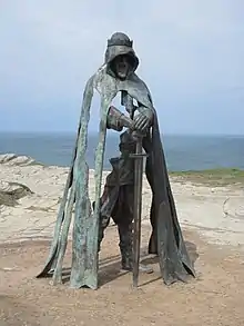 Gallos is an 8-foot-tall (2.4 m) bronze sculpture by Rubin Eynon located at Tintagel Castle, a medieval fortification located on the peninsula of Tintagel Island adjacent to the village of Tintagel (Trevena), North Cornwall, in the United Kingdom. It is a representation of a ghostly male figure wearing a crown and holding a sword. It is popularly called the "King Arthur statue", but the site's owner English Heritage states that it is not meant to represent a single person and reflects the general history of the site, which is likely to have been a summer residence for the kings of Dumnonia.