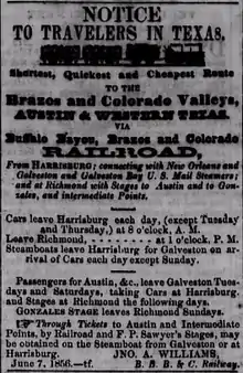 Andrew Briscoe initiated the first attempt to establish a railroad from Harrisburg, Texas, to the Brazos and Colorado Rivers. Houston's Morning Star published a notice on May 16, 1840, entitled "Harrisburg and Brazos Railroad," that claimed, "A large number of laborers are engaged at present in throwing up the track and preparing for rails at an early season, and a greater number will soon be employed."[3]
