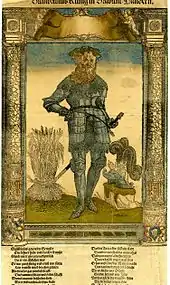Gambrinus is sometimes erroneously called a patron saint,[1] but he is neither a saint nor a tutelary deity. It is possible his persona was conflated with traditional medieval saints associated with beermaking, like Arnold of Soissons. In one legendary tradition, he is beer's inventor or envoy. Although legend attributes to him no special powers to bless brews or to make crops grow, tellers of old tall tales are happy to adapt them to fit Gambrinus. Gambrinus stories use folklore motifs common to European folktales, such as the trial by ordeal. Some imagine Gambrinus as a man who has an enormous capacity for drinking beer.[1]