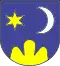 The blazon of the village coat of arms is Azure in dexter a Mullet of Six Or in sinister an Increscent inverted Argent in base Coupeaux of the second.[3]