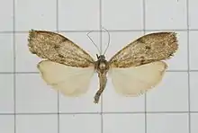 The wingspan of the male is about 28 mm and the female's is 34 mm. Male has brownish fuscous and anal tuft ochreous. Costa and forewing apex is ochreous. Hindwings pale. Female has indistinct angled fuscous band just beyond the middle of forewing. There are some dark marks can be seen on outer margin.[2]