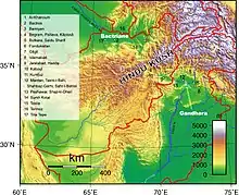 In the view of Buddhist sources, Gandhāra was one of the great regions (mahjanapada) of ancient India (a geographical concept that included many other parts of modern South Asia). Under the Mauryan empire (ca. 300–185 BCE), its capital was the city of Taxila.[6] The center of ancient Gandhāra was the Peshawar basin in northwestern Pakistan which extends westward into Afghanistan along the Kabul River.[7] This region exerted cultural and linguistic influence on what has been called "Greater Gandhāra" which encompasses the surrounding areas eastwards across the Indus River (such as Taxila), north towards the Swat Valley and Upper Indus, west towards Bamiyan and across the Hindu Kush into Bactria and the Oxus river valley.[8]