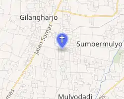 Ganjuran Church is located in Ganjuran, Bambanglipuro, Bantul, 17 kilometres (11 mi) south of Yogyakarta. It is built on 2.5 hectares (6.2 acres) of land and in addition to the church has a parking lot, temple (candi), residence for pastors, and other maintenance buildings. As of 2011, its total congregation is 8,000, consisting mostly of farmers, merchants, and labourers.[2]