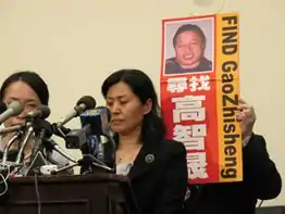 Gao Zhisheng[1] (born 20 April 1964) is a Chinese human rights attorney and dissident known for defending activists and religious minorities and documenting human rights abuses in China. Because of his work, Zhisheng has been disbarred and detained by the Chinese government several times, and severely tortured. He last disappeared in February 2009 and was unofficially detained until December 2011, when it was announced that he has now been imprisoned for three years. His commitment to defending his clients is influenced by his Christian beliefs and their tenets on morality and compassion.[3]