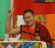 The Eighth Garchen Rinpoche (Tib. མགར་ཆེན་རིན་པོ་ཆེ་, Wyl. mgar chen rin po che), also called Garchen Triptrul Rinpoche (Tib. མགར་ཆེན་ཁྲི་སྤྲུལ་རིན་པོ་ཆེ་, Wyl. mgar chen khri sprul rin po che), is a Tibetan Buddhist teacher in the Drikung Kagyu lineage.[1] Born April 1936 in Nangchen, Kham,[1] he is believed to be an incarnation of Siddha Gar Chodingpa, a heart-disciple of Jigten Sumgön, founder of the Drikung Kagyu lineage in the thirteenth century CE. He is also believed to have incarnated as Mahasiddha Aryadeva in ancient India - the lotus-born disciple of Nagarjuna himself. He was known as Lonpo Gar, the minister of Tibetan dharma king Songtsen Gampo in the seventh century CE.