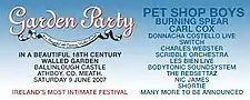 The Garden Party was an annual Irish music festival, held for two years in 2006 and 2007 at Ballinlough Castle in Athboy, County Meath. Both events took place over one day in June. The festival was promoted by Pod Concerts & Bodytonic Music.[1] Stages included the Main Stage, the Ambient Lounge, Pogo Tent, The Pond, Second Nature, Holistic Haven, The Rose Garden and Enchanted Playground.