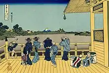 Monet called this work in his correspondence "the Chinese painting in which there are flags". His friend Pierre-Auguste Renoir referred to it as "the Japanese painting". In the 1860s, the composition's flat horizontal bands of colour would have reminded the sophisticated of Japanese colour wood-block prints,[1] which were avidly collected by Monet, Manet, Renoir, Whistler, and others in their circle. The print by the Japanese artist Hokusai that may have inspired this picture, Turban-shell Hall of the Five-Hundred-Rakan Temple (1830),[3] remains today at Monet's house-museum at Giverny.[4]