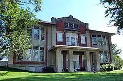 It is a two-story school built upon a raised basement. Its National Register nomination states: "It is distinguished by its use of two-story bowed bays on either side of a parapeted central bay. The red brick exterior is divided by massive, squared pilasters of grey stucco over brick that give the building a neoclassical character."[2]