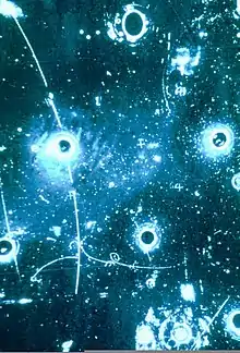 When recording an event, the chamber was illuminated and photographed. The illumination system emitted light that was scattered at 90° by the bubbles, and sent to the optics. The light source consisted of 21 point flashes disposed at the ends of the chamber body and over one half of the cylinder.[8] The optics were situated in the opposite half of the cylinder, distributed in two rows parallel to the chamber axis, each rows having four optics. The objective was made by an assembly of lenses with a 90° angular field followed by a divergent lens which extends the field to 110°.