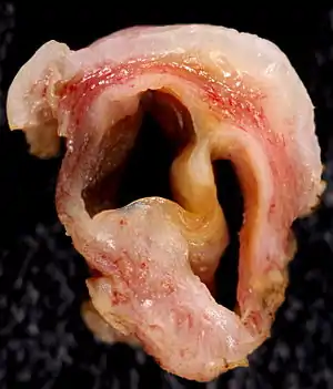 A Gartner's duct cyst (sometimes incorrectly referred to as vaginal inclusion cyst) is a benign vaginal cyst that originates from the Gartner's duct, which is a vestigial remnant of the mesonephric duct (wolffian duct) in females.[1][2] They are typically small asymptomatic cysts that occur along the lateral walls of the vagina, following the course of the duct. They can present in adolescence with painful menstruation (dysmenorrhea) or difficulty inserting a tampon. They can also enlarge to substantial proportions and be mistaken for urethral diverticulum or cystocele.[3][4] In some rare instances, they can be congenital.[2]