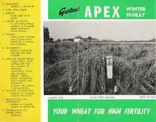 The 1960 Report of the Committee on Transactions in Seeds set up by Parliament entitled Plant Breeders' Rights [29] stated that whilst two thirds of breeding work was by then carried out by government organisations, one third was in the hands of private breeders. And yet the only non-government funded agricultural crop plant breeding, research and testing establishment visited by the Committee was to Gartons Limited.[30] The United Kingdom's Plant Varieties and Seeds Act 1964 allowed plant breeders to fully protect and be rewarded for their introductions. The last variety bred by Gartons, 'Apex' wheat, was the first British bred wheat to be awarded plant breeders rights in 1967 under this legislation.[31][32]