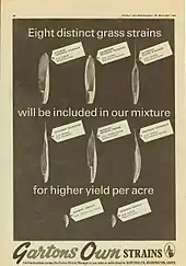 In 1965 Peter Darlington[38] became chairman of Gartons Limited. In a dramatic change of direction in 1967 Gartons Limited ceased retailing seeds directly to farmers. Instead a new brand was created, Gartons GROplan, and marketing became wholesale through agricultural merchants throughout the United Kingdom.