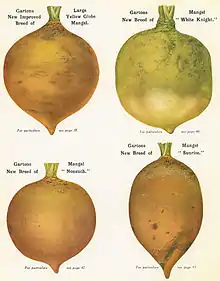 Mangel varieties bred and introduced to UK agriculture include Large Yellow Intermediate in 1900, Mammoth Long Red (1900), Golden Tankard (1900), Large Yellow Globe (1900), Select Golden Globe (1900), Sugar (1905), Red Intermediate (1905), Devon Yellow Intermediate (1907), Golden Gatepost (1909), Large Red Globe (1910), Large Golden Globe (1910), Nonsuch (1917), Sunrise (1919), White Knight (1922), New Combination (1924), Lemon Globe (1927), Gartons Number 432 (1928), Gartons Number 47 (1931), White Chief (1935), Gartons Number 601 (1960).