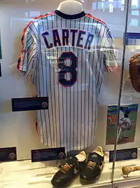 Carter was inducted into the New York Mets Hall of Fame in 2001.[41] While the Mets have not retired number eight, it has remained unused since his election to the Hall of Fame in 2003. In 2001, he was elected into the Canadian Baseball Hall of Fame along with Dave McKay, and his number eight was retired by the Expos. After the Expos moved to Washington, D.C. to become the Washington Nationals following the 2004 season, a banner displaying Carter's number along with those of other Expos stars Andre Dawson, Tim Raines and Rusty Staub was hung from the rafters at the Bell Centre, home of the NHL's Montreal Canadiens. In Washington, D.C., Carter is recognized in the Ring of Honor at Nationals Park.[42]