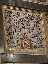 Gaspar de Borja y Velasco (26 June 1580[1] – 28 December 1645) was a Spanish cardinal, ecclesiastic and politician. He belonged to the house of Borgia (though he always used the Spanish spelling of Borja) and served as Primate of Spain, Archbishop of Seville, Archbishop of Toledo and viceroy of Naples.[2] He was the great-great-great-great-grandson of Pope Alexander VI.