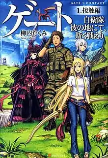 ![]() Cover of the first edition of Gate volume 1 featuring the main characters (from left to right): Rory Mercury, Yōji Itami, Tuka Luna Marceau and Lelei La Lelena. | |