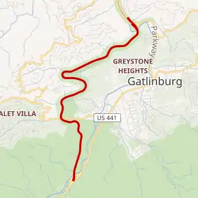 After splitting with U.S. 441, the bypass almost immediately crosses over the West Prong of the Little Pigeon River. The road then begins to climb in elevation as it traverses Cove Mountain overlooking Gatlinburg from the west. It crosses over (but does not intersect) Ski Mountain Road, before winding its way over to its only mid-route intersection at Campbell Lead Road, which is accessed via a short two-way access road. After the intersection, the parkway begins to descend the mountain and again crosses the West Prong of the Little Pigeon River, before ending at a second interchange with U.S. 321/441.[1]