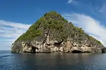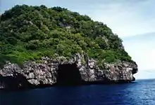 There is an underwater cave where divers encounter poisonous sea snakes, colored fishes and some species of shark believed to be sleeping during the day, which can be seen about 30 meters deep on the ground of the sea. The view inside and under the water cave is magnificent and divers would often liken it as if you are looking to a glass stained window with sparkling blue color and the glowing water from the sunlight. Its elevation was recorded at 188 feet (57 m) in 1919.[1]