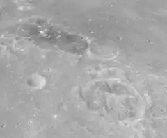 This crater has a low rim and an irregular interior that makes it a relatively inconspicuous formation. The rim is roughly circular but somewhat uneven in outline. On the inner floor are several ridges that divide up the interior into several minor peaks and valleys. A pair of tiny, bowl-shaped craters are attached to the southern edge of the crater rim.