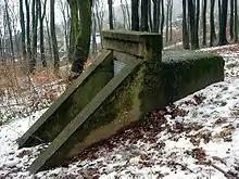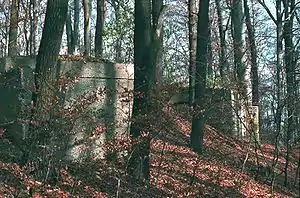 From the main entrance at the top of the Gallitzinberg hill, a blast-proofed staircase descended 25 meters to the main tunnel (profile, 2 x 2 meters) which ran for about 100 meters horizontally to the north, ending in a secondary entrance where a small power plant was situated. Another tunnel diverged eastward towards the 17 x 5 meter actual bunker core.[1] On its upper level were the communications facilities, with landlines to all civil emergency services, the Führer Headquarters, the Oberkommando der Luftwaffe and even the Kriegsmarine. On the lower level were the command center, a meeting room and Schirach's personal facilities. The tunnel system had a total length of 340 meters. A tripartite security zone system controlled access to the installation.
