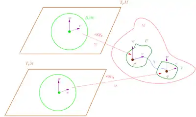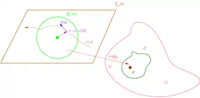 where is the unique geodesic with and tangent and is chosen small enough so that for every the geodesic is defined in 1. So, if is complete, then, by the Hopf–Rinow theorem, is defined on the whole tangent space.