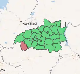 Gavrilovo-Posadsky District (Russian: Гаври́лово-Поса́дский райо́н) is an administrative and municipal district (raion), one of the twenty-one in Ivanovo Oblast, Russia.[1] It is located in the southwest of the oblast. The area of the district is 960 square kilometers (370 sq mi).[2] Its administrative center is the town of Gavrilov Posad.[1] Population: 17,591 (2010 Census);[3] 20,430 (2002 Census);[9] 23,334 (1989 Census).[10] The population of Gavrilov Posad accounts for 36.6% of the district's total population.[3]