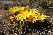 This ground-hugging grassland species is one of the first plants to flower in spring, appearing in profusion as small clumps of yellow or white flowers between low grass tussocks or burnt stubble, or as leafless single flowers seemingly stuck into the soil. Flowering lasts for only a few weeks after the first rains. The buttercup-yellow rays often occur in forms having dark spots at the base.[1] The showy flowers open only in strong sunlight, closing with fading light and re-opening the following day. This plant is perennial and grows from a woody rootstock. The leaves are tufted and linear in shape, white-felted on the underside, and exuding a milky latex when damaged.