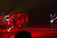 Short of money, they began opening concerts at venues such as Toronto's Victory Burlesque Theatre for the glam rock band New York Dolls.[30] By 1972, Rush began performing full-length concerts, mainly consisting of original songs, in cities including Toronto and Detroit. As they gained more recognition, they began performing as an opening act for groups such as Aerosmith, Kiss, and Blue Öyster Cult.[31]