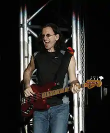 Music industry writer Christopher Buttner, who interviewed Lee in 1996, described him as a prodigy and "role model" for what every musician wants to be, noting his proficiency on stage. Buttner cited Lee's ability to vary time signatures, play multiple keyboards, use bass pedal controllers and control sequencers, all while singing lead vocals into as many as three microphones. Buttner adds that few musicians of any instrument "can juggle half of what Geddy can do without literally falling on their ass."[23] As a result, notes Mulhern, Lee's instrumentation was the "pulse" of the group and created a "one-man rhythm section", which complemented guitarist Alex Lifeson and percussionist Neil Peart.[26] Bass instructor Allan Slutsky, or "Dr Licks", credits Lee's "biting, high-end bass lines and creative synthesizer work" for helping the group become "one of the most innovative" of all the groups that play arena rock.[35] By 1989, Guitar Player magazine had designated Lee the "Best Rock Bass" player from their reader's poll for the previous five years.[35]