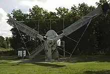 As a 17-year-old, Johannes Juul (1887–1969) had studied wind electricity applications under Poul la Cour at Askov Højskole, a folk high school, in 1904. In the early 1950s, he built two smaller alternating current turbines which operated at Vester Egesborg near Næstved and on the island of Bogø.[3] His three-bladed Gedser facility (1957) was Denmark's first large wind turbine. With a blade span of 24 m (79 ft), it produced 200 kW of alternating current fed directly into the grid. Its electromechanical yawing, asynchronous generator, and the three stall-regulated blades with emergency aerodynamic tip brakes (these were invented by Juul) is a design that is still widely used in Denmark. Stall control was provided through an asynchronous generator.[4] The turbine, which for many years was the world's largest, operated from 1957 to 1967 without maintenance, demonstrating incredible durability. In connection with NASA testing for the U.S. wind energy programme, it was refurbished in 1975 and brought back into operation.[3] It continued to run for a few years, providing test data for the further development of wind turbines in Denmark.[5] Over the course of its lifetime, the Gedser wind turbine generated 2.2 million kW-hours (7.9 TJ).[6]