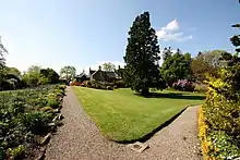 Geilston Garden was developed more than two hundred years ago with a date given for its development being 1797,[1] combining several features (traditional walled garden, kitchen garden, wooded area). The walled garden has a dominating 100-foot Wellingtonia (Sequoiadendron giganteum) in the centre of the lawn. The Geilston burn wends its way through the north of the estate towards the River Clyde in Cardross. The origins of the garden were most likely a result of the 1770 Montgomery Act, which saw the land around the house enclosed and planting undertaken.[2]
