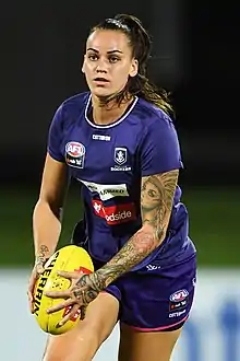 Gemma Houghton (born 31 December 1993) is an Australian rules footballer playing for the Fremantle Football Club in the AFL Women's competition. Houghton was recruited by Fremantle as a free agent in October 2016.[1] She made her debut in the thirty-two point loss to the Western Bulldogs at VU Whitten Oval in the opening round of the 2017 season.[2] She played every match in her debut season to finish with seven matches.[3]