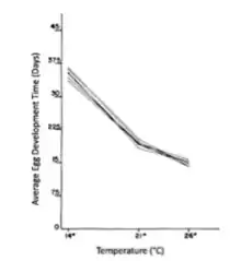 - In Drosophila eggs: Contrary to the aforementioned examples, length of egg development in Drosophila as a function of temperature demonstrates the lack of gene–environment interactions. The attached graph shows parallel reaction norms for a variety of individual Drosophila flies, showing that there is not a gene–environment interaction present between the two variables. In other words, each genotype responds similarly to the changing environment producing similar phenotypes. For all individual genotypes, average egg development time decreases with increasing temperature. The environment is influencing each of the genotypes in the same predictable manner.[25]