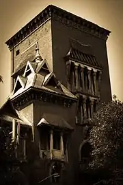The Chennai GPO building can be described as a red-painted Victorian County-Colonial or Victorian Gothic-Colonial overlay on Indo-Saracenic design. It is a three-storied building, 352 ft long and 162 ft wide, with 125-ft tall twin towers.[2] The building is spread over an area of 6,085.30 square meters (66,000 square feet).[6] The twin towers, when built, sported the Kerala roof-influenced "caps" atop as favoured by Chisholm, influenced by his building assignments in Travancore. However, a storm in the mid-20th century removed these crowns.[2] Besides a high-ceilinged central hall, the ground floor provided space for stores, kitchen, servants, and so on. The first floor was used for offices and the second floor served as accommodation for officers.[5] The building also had a unique exhaust facility meant to absorb the stink from the open drainage.[4]