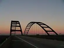 The bridge has red warning lights atop the parallel support arches which, when combined with the shape of the supporting arches when approached from certain directions, have caused the bridge to gain the nickname "Dolly Parton Bridge".[4]
