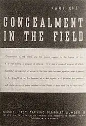 At the end of 1940, Barkas and his camoufleurs were sent to Egypt, where he arrived on the Andes on New Year's Day 1941. He arranged a flight to observe the desert from the air, noting patterns that he named as "Wadi", "Polka Dot" and so on that he hoped to use for camouflage.[16] During 1941 the structure of the camouflage unit changed and grew rapidly, at first with little official recognition and constantly shifting names.[17] To get his fledgling unit recognised, he printed an unusually elegant booklet called "Concealment in the Field" in Cairo,[lower-alpha 2] the idea being to produce something clear, readable, and above all obviously different from the mass of army manuals. He was surprised to have this at once recognised as an "operational requirement" by the British Army's Middle East command, that is, as an essential item for every army unit.[18]
