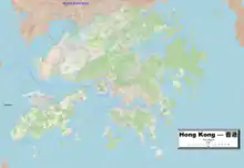 Hong Kong is on China's southern coast, 60 km (37 mi) east of Macau, on the east side of the mouth of the Pearl River estuary. It is surrounded by the South China Sea on all sides except the north, which neighbours the Guangdong city of Shenzhen along the Sham Chun River. The territory's 2,755 km2 (1,064 sq mi) area consists of Hong Kong Island, the Kowloon Peninsula, the New Territories, Lantau Island, and over 200 other islands. Of the total area, 1,073 km2 (414 sq mi) is land and 35 km2 (14 sq mi) is water.[5] The territory's highest point is Tai Mo Shan, 957 metres (3,140 ft) above sea level.[6] Urban development is concentrated on the Kowloon Peninsula, Hong Kong Island, and in new towns throughout the New Territories.[7] Much of this is built on reclaimed land, due to the lack of developable flat land; 70 km2 (27 sq mi) (six per cent of the total land or about 25 per cent of developed space in the territory) is reclaimed from the sea.[8]