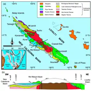 The geology of the Collectivity (autonomous region) is divided into two relatively separated parts: the larger Grande Terre in the West and the Loyalty Islands in the East.[2] The smaller islands are younger and are believed to have emerged as a volcanic island arc in the Eocene, but are currently covered by coral reefs and carbonate rocks.[2] For the main island of Grande Terre, there are diverse geological units. Before illustrating each of them and their implications, here is the table to summarize the units in a reversed chronological order, as the older rocks usually occupy deeper locations: