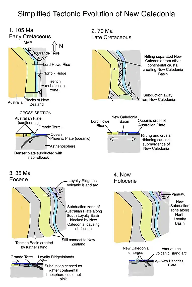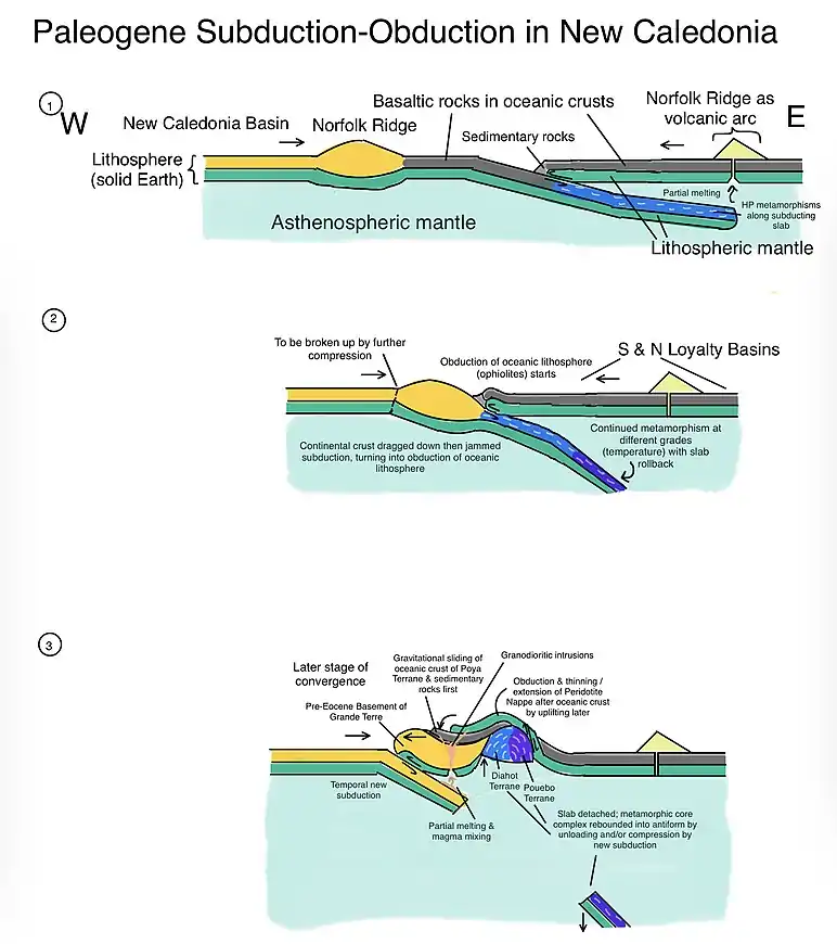 The presence of the subduction-obduction complex suggests a sequence of a new intra-oceanic subduction zone with dextral components.[2][13] The interception of the trench and the Norfolk Ridge evolved into Grande Terre.[13] The basaltic Poya Terrane and the South Loyalty Basin can be interpreted as the new forearc, with an extinct trench along the Basin, while the North Loyalty Basin is the backarc.[2] As the oceanic lithosphere of the Australian Plate was subducting under an oceanic plate in the northeast, the descending slab metamorphosed to become the Diahot and Pouébo Terranes under high pressure.[2] The moisture released from metamorphism caused partial melting, initiating a series of extrusive volcanism to form the arc of Loyalty Ridge/Islands.[2] The oblique subduction was then jammed by the more buoyant continental lithosphere of the Norfolk Ridge, which resists sinkage further into the mantle.[2][46] Instead, the oceanic lithosphere obducted above the basement of the Norfolk Ridge, thus bringing units like the Poya Terrane and the Peridotite Nappe onto Grande Terre.[2][36]