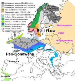 The Baltic Sea sedimentary basin was formed on top of the East European Craton millions of years after it consolidated.[1] This occurred during the Late Ediacaran and the Early Cambrian when the weakest part of the craton was reactivated. Since then the basin has been deepened mainly through subsidence caused by extensional tectonics.[1] In the northern part of the Baltic Sea basin, including the Gulf of Bothnia and the Bothnian Sea, the depression originated as a series of interconnected rifts that were not active enough to split the East European Craton.[2] Subsidence in the southern parts was most pronounced during a period starting in the Late Ordovician and lasting to Middle Silurian. At this time the Baltic sea basin and the East European Craton were part of a continent and tectonic plate known as Baltica. Baltica collided with the continent Laurentia in the Late Silurian and Early Devonian. This caused compression in the basin in a north-west to south-east direction. This collision further led to the formation of a fold and thrust belt and faults north of the Danish–North German–Polish Caledonides. During the Carboniferous and Permian the basin areas around Rügen and northern Poland were subject to the intrusion of magma. After the Permian there was little tectonic activity in the Baltic for most of the Mesozoic until the Cretaceous. During the Cretaceous a tectonic inversion occurred in the southwestern part of the basin.[1]