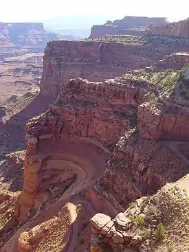 Coastal sand dunes and marine sand bars once again became dominant, creating the cross-bedded cliff-forming White Rim Sandstone. It is exposed as a topographic bench 1200 feet (365 m) below the top of Island in the Sky (thus earning its name) and along the White Rim Road. A fossilized offshore sand bar made of the White Cliff Sandstone is also exposed in the Elaterite Basin. A tarry dark-brown oil called elaterite seeps out of the structure, giving the basin its name.