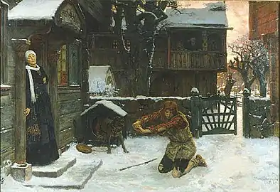 Inspired by that experience, upon returning home he painted an historical scene of Sten Sture the Elder entering Stockholm. Despite its obvious debt to Leys, it was praised by King Oscar II and given a "Royal Medal".[2] Shortly after, he set out on a tour of the Mediterranean; visiting Egypt, Palestine, Syria and Greece and returning through Hungary. In 1866 he visited Rome, then went to Antwerp, where he lived with Leys until his death in 1869. This was followed by studies with artist Karl von Piloty in Munich. [6]