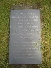 Len Garrison, director of Afro-Caribbean Family and Friends (AcFF), ensured that Africanus was included in Nottingham Castle's 1993 Black Presence exhibition. It was only in 2003 that, after painstaking research, Africanus's grave was uncovered, despite its worn inscription, in the churchyard of St. Mary's Church, Nottingham. His wife was buried alongside him. Their children are buried in a separate grave nearby.