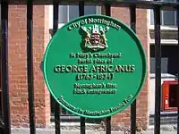 A memorial green plaque in memory of Africanus, "Nottingham's first black entrepreneur", was unveiled on St. Mary's churchyard railings in April 2003, and in October 2014 his place of business and residence, formerly 28 Chandlers Lane, was recognised with a blue heritage plaque erected by the Nubian Jak Community Trust.[5]