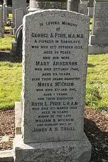From 1905, Pirie had begun to suffer from hand problems and by 1925 had had to give up work due to the damage caused to his hands and eyes through exposure to radiation during his work with x-rays.[5] By 1926 he had lost the sight in one eye, had much reduced vision in the other, and had had both of his hands amputated due to radiation related tumours.[6][4] One of Pirie's hands is held at the Pathology department of Dundee's Ninewells Hospital.[6] In 1926 the Carnegie Hero Trust awarded him their bronze medal and £200 per year, and he was granted a Civil List pension of £75.[5] In 1926 he was also given £1200 which had been raised by the people of Dundee in recognition of his work there and his subsequent health problems.[5] He died in Dundee on 27 October 1929 aged 66.[5] He is buried in the Western Cemetery, Dundee. The grave lies on the central path on the main upper terrace.