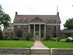 The George B. Dryden House is a historic house located at 1314 Ridge Avenue in Evanston, Illinois. The house was built in 1916 for George B. and Ellen A. Dryden. George was a successful Chicago businessman, while Ellen was the heiress of George Eastman; together, the couple was worth over $9 million. Architect George W. Maher designed the Georgian Revival house. While Maher was better known as a Prairie School architect, the Drydens requested a Georgian design inspired by Ellen's memories of Eastman's home. The three-story house features an entrance portico supported by four Corinthian columns and topped by a pediment. The house is faced with brick and features quoins at the corners and keystones above the windows. A wooden frieze and cornice run below the base of the roof, which begins below the third floor and features several projecting dormers.[2]